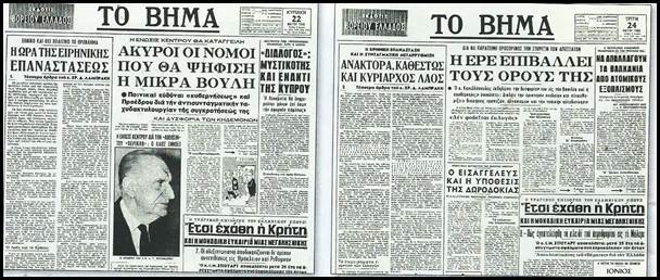 Η αναδημοσίευση συνεχίστηκε απρόσκοπτα και συνοδεύτηκε την επομένη με το συμπέρασμα: «Η ειρηνική επανάστασις, την οποίαν εζήτει και της οποίας την ιστορικήν αναγκαιότητα απεδέχετο ανενδοιάστως ο αρθρογράφος του “Βήματος”, έγινε. Εγινεν έν έτος αργότερον από τας διαπιστώσεις του, όταν το αδιέξοδον, που είχεν επισημάνει, έφθασεν εις το οριστικόν απροχώρητον. Δεν έγινε από εκείνους που θα ήθελε να αναλάβουν ο αρθρογράφος του “Βήματος”. Αλλ’ έγινε από τους μόνους, οι οποίοι ήσαν εις θέσιν να την πραγματοποιήσουν».7
