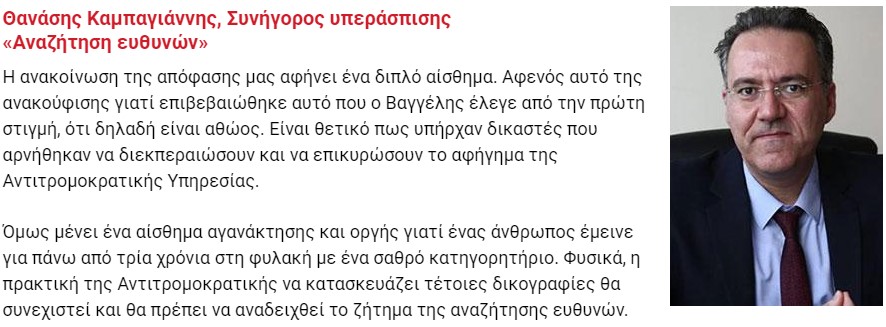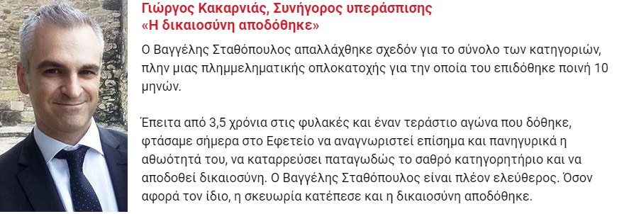 Κατέρρευσε στο εφετείο το σαθρό κατηγορητήριο και ο πρωτόδικα καταδικασμένος σε 19 χρόνια κάθειρξη αναρχικός Βαγγέλης Σταθόπουλος αθωώθηκε για συμμετοχή σε τρομοκρατική οργάνωση. ● Καταδικάστηκε σε 10 μήνες με αναστολή για οπλοκατοχή. ● Ποινή 14 ετών στον Δημήτρη Χατζηβασιλειάδη. ● Σε 3 χρόνια με αναστολή ο Διονύσης Μπάκας.