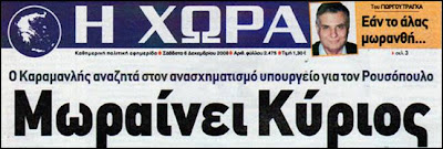 Σήμερα δίνει ρεσιτάλ στην φυλλάδα του βάζοντας στο στόχαστρο του τον Καραμανλή. «Το δυνατό χαρτί της Ν.Δ», ο «ικανότερος» και «καταλληλότερος» έγινε «μωρός» γιατί σύμφωνα με τις πληροφορίες του Τράγκα «αναζητά υπουργείο στον ανασχηματισμό για τον Ρουσόπουλο».
