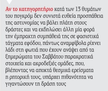 Αν το κατηγορητήριο κατά των 13 θυμάτων του πογκρόμ δεν συνιστά ευθεία προσπάθεια της αστυνομίας να βάλει πλάτη στους δράστες και να εκδηλώσει άλλη μία φορά την έμπρακτη συμπάθειά της σε φασιστικά τάγματα εφόδου, πάντως αναμφίβολα ρίχνει λάδι στη φωτιά που έχουν ανάψει από τα ξημερώματα του Σαββάτου παρακρατικά στοιχεία και ακροδεξιές ομάδες, που, βλέποντας να αποκτά θεσμικά ερείσματα η ρητορική τους, υπάρχει πιθανότητα να γιγαντώσουν τη δράση τους.