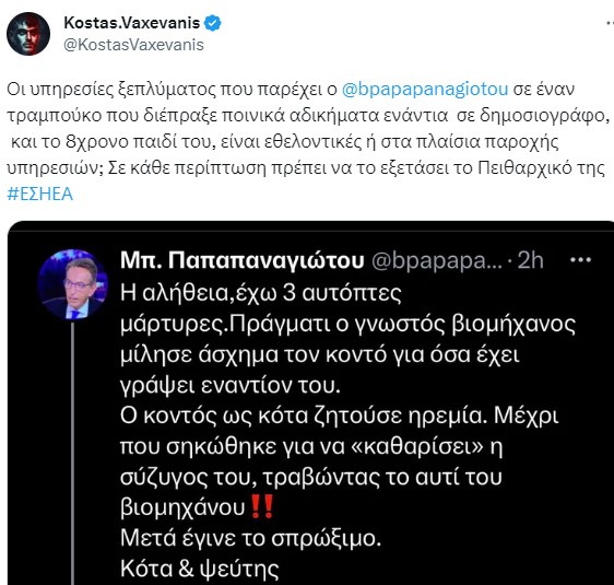 Από την πλευρά του, από κει και πέρα, ο Παπαπαναγιώτου με αλλεπάλληλα τουιταρίσματα αποδίδει μια σειρά χαρακτηρισμούς στον “κοντό Βαξεβάνη” όπως ότι είναι “ηλίθιος, αλήτης και θρασύς κ.α”.