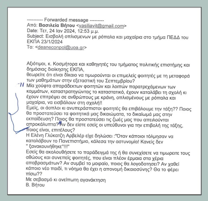 Η πραγματικότητα βέβαια είναι εντελώς διαφορετική, σύμφωνα με στοιχεία που παρουσιάζει σήμερα η «Εφ.Συν.». Στις 24 Ιανουαρίου 2024, πριν δηλαδή από τα δημοσιεύματα, αποστέλλεται ένα email από μια φοιτήτρια του τμήματος Πολιτικής Επιστήμης και Δημόσιας Διοίκησης του ΕΚΠΑ προς τον κοσμήτορα της σχολής και προς τους καθηγητές. Η… «φοιτήτρια» ονομάζεται Βασιλεία Βίτου και αναφέρει: «Αξιότιμοι κ. Κοσμήτορα και καθηγητές, θεωρείτε ότι είναι δίκαιο να τιμωρούνται οι επιμελείς φοιτητές με τη μεταφορά των μαθημάτων στην εξεταστική Σεπτεμβρίου; Μια χούφτα απαράδεκτων φοιτητών έχει επιτρέψει σε ανθρώπους με κράνη, οπλισμένους με ρόπαλα και μαχαίρια, να εισβάλουν στη σχολή. Εμείς, οι ανυπεράσπιστοι φοιτητές, θα επιβάλουμε την τάξη; Ποιος θα προστατέψει τα φοιτητικά μας δικαιώματα, το δικαίωμά μας στην εκπαίδευση;». Πρόκειται ακριβώς για το ίδιο κείμενο που επικαλείται τρις η «Καθημερινή». Μόνο που δεν υπάρχει καμία τέτοια φοιτήτρια σε αυτό το Τμήμα!