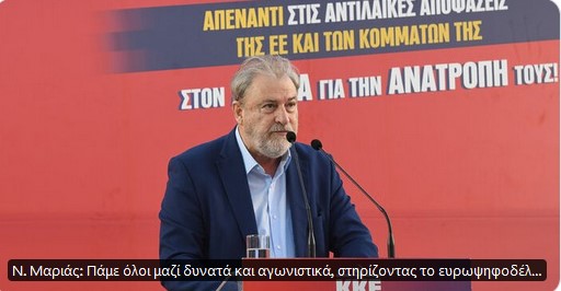 Απλώς με έναυσμα μας, μια ανάρτηση στην ιστοσελίδα 902 στην οποία διαβάζουμε ότι “στην μεγάλη συγκέντρωση στο Μενίδι, με ομιλητή τον ΓΓ της ΚΕ του ΚΚΕ,  Δημήτρη Κουτσούμπα, απεύθυνε χαιρετισμό ο Νότης Μαριάς, καθηγητής Θεσμών της ΕΕ στο Πανεπιστήμιο Κρήτης και πρώην ευρωβουλευτής”, και δηλώνει ότι υποστηρίζει το ευρωψηφοδέλτιο του ΚΚΕ “για να έχουμε ισχυρό ΚΚΕ στην Ευρωβουλή όπου παίρνονται οι αντιλαϊκές αποφάσεις αλλά και στους δρόμους όπου ανατρέπονται οι αντιλαϊκές και αντικοινωνικές πολιτικές της ΕΕ”, να γράψουμε δυο λόγια.
