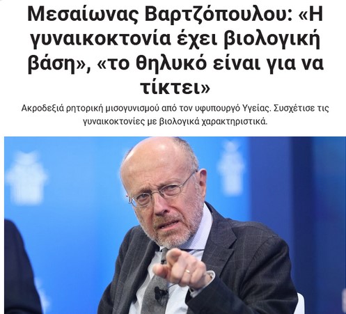 Κι αυτό σαν συνέχεια των δηλώσεων από τον υφυπουργό Υγείας και υπεύθυνο για την Ψυχική Υγεία Δημήτρη Βαρτζόπουλο που, μεταξύ άλλων, συσχέτισε τις γυναικοκτονίες με βιολογικά χαρακτηριστικά και ισχυρίστηκε πως «είναι η φύση των πραγμάτων το αρσενικό να είναι επιθετικό» καθώς «κυνηγάει την τροφή». Ο υφυπουργός που είναι υπεύθυνος για την πολιτική ψυχικής υγείας επικαλέστηκε επικίνδυνες αντιεπιστημονικές θεωρίες… περασμένων αιώνων.