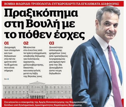 Δεν μπορεί να φέρουμε στην μνήμη μας μια τόσο σοβαρή καταγγελία όπως αυτή που διατυπώνεται σήμερα στο πρωτοσέλιδο της “Εστίας” να έχει γίνει από κόμμα της αντιπολίτευσης ή από αρθρογράφο εντύπου αν εξαιρέσουμε το Documento που κι αυτό κυκλοφορεί σήμερα με τίτλο “Πραξικόπημα στην βουλή με το πόθεν έσχες” και υπότιτλο: “Βόμβα Φλωρίδη: Τροπολογία-συγχωροχάρτι για εγκλήματα διαφθοράς”. Σύμφωνα με την ίδια εφημερίδα είναι στα κάγκελα ο επικεφαλής της Αρχής Καταπολέμησης της Νομιμοποίησης Εσόδων από Εγκληματικές Δραστηριότητες Χαράλαμπος Βουρλιώτης