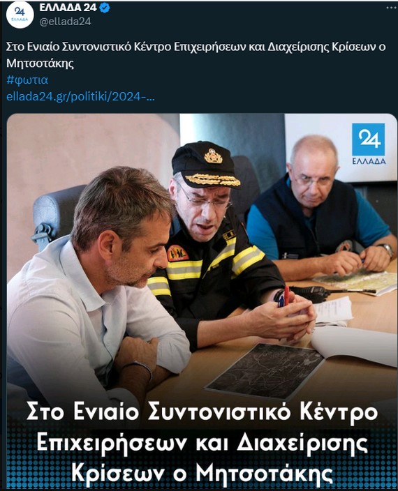 Πάμε τώρα σε κάτι άλλο. Χτες ο Κυριάκος Μητσοτάκης βρέθηκε στο Ενιαίο Συντονιστικό Κέντρο Επιχειρήσεων και Διαχείρισης Κρίσεων για να ενημερωθεί, υποτίθεται, για την εξέλιξη αντιμετώπισης των πυρκαγιών.