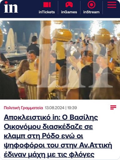 Θα περιμένουμε να δούμε ποια θα είναι η εξέλιξη της αποκάλυψης του in.gr από την οποία ενημερωθήκαμε ότι την ώρα που η Ανατολική Αττική ήταν κυριολεκτικά στις φλόγες, ένας βουλευτής της ΝΔ από αυτή ακριβώς την περιφέρεια που ταυτόχρονα είναι και μέλος της κυβέρνησης, ως υφυπουργός Υποδομών Μεταφορών, προτιμούσε να διασκεδάζει σε νυχτερινό κέντρο στην Ρόδο, σε ξέφρενο πάρτι που περιλάμβανε και λάιβ fire performance, όπως φαίνεται από τα βίντεο και τις φωτογραφίες που κυκλοφόρησαν.
