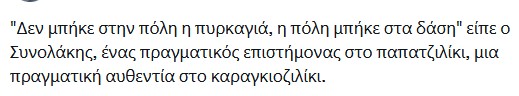 Πάλι καλά που δεν μας ζητάει δηλαδή να δώσουμε τα εύσημα μας στην κυβέρνηση για την “αποτελεσματικότητά” της. Το ότι η φωτιά ξέσπασε στον Βαρνάβα και έφτασε μέχρι τα Βριλήσσια και το Χαλάνδρι, σκορπώντας τον όλεθρο σε τεράστιες περιοχές αφήνοντας πίσω της μια νεκρή, τεράστιες υλικές ζημιές και ανυπολόγιστη καταστροφή στο οικοσύστημα, είναι λεπτομέρειες για τον κ. Συνολάκη. Αυτός και η κυβέρνηση που υπηρετεί δηλώνουν ικανοποιημένοι “γιατί η φωτιά δεν έφτασε στην θάλασσα”.