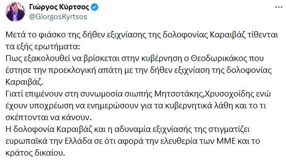 Δεν ξέρουμε τι όνειρο είδε ο Γιώργος Κύρτσος και επαναφέρει σήμερα -με ανάρτησή του στην πλατφόρμα “Χ”- το κυβερνητικό φιάσκο της δήθεν εξιχνίασης της δολοφονίας του δημοσιογράφου Καραϊβάζ, Τυχαίο; Δεν ξέρουμε μπορεί …