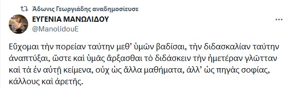 Υ.Γ. Επισκεφτήκαμε τον λογαριασμό που έχει στην πλατφόρμα “Χ” ο Αδωνις Γεωργιάδης για να δούμε αν θα είχε την παραμικρή αντίδραση σ’ αυτό το δημοσίευμα. Ακρα του τάφου σιωπή. Αρκείται να διαφημίζει το “εκπαιδευτικό” μαγαζί που έχει μαζί με την γυναίκα του.