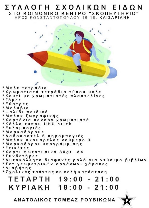 Η αρχική φώτο είναι από τα σχολικά είδη που έχει συγκεντρώσει ο δυτικός τομέας του Ρουβίκωνα στο Χαϊδάρι, ενώ η σχετική πρωτοβουλία του Ανατολικού Τομέα της συλλογικότητας έχει σημείο συνάντησης το Κοινωνικό Κέντρο Σκοπευτήριο (Ηρώς Κωνσταντοπούλου 16-18).
