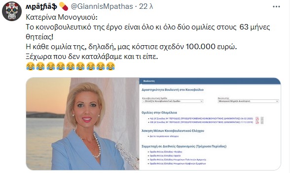 Αν έχετε συναντήσει στους τηλεοπτικούς δέκτες σας την βουλευτή Κυκλάδων της Νέας Δημοκρατίας Κατερίνα Μονογιού, να αγορεύει από το βήμα της βουλής, ή αν έτυχε να παρακολουθήσετε αυτό το επιφανή στέλεχος του κυβερνητικού κόμματος να είναι καλεσμένη σε κάποια τηλεοπτική εκπομπή, θα συμφωνήσετε απόλυτα με την διαπίστωση που κάναμε – και μάλιστα για να την τεκμηριώσουμε παραθέσαμε και 2 βίντεο- ότι στο πρόσωπο της απεικονίζεται η συμπυκνωμένη “αριστεία” της Ν.Δ.