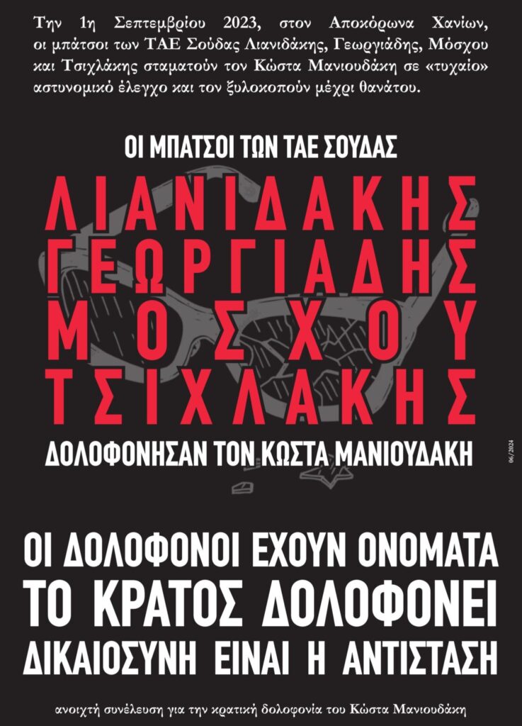 «Όπως έχουμε ήδη ανακοινώσει, ο Εισαγγελέας Πρωτοδικών Χανίων άσκησε ποινική δίωξη για ανθρωποκτονία από πρόθεση με ενδεχόμενο δόλο από κοινού και σε ήρεμη ψυχική κατάσταση κατά των τεσσάρων αστυνομικών που εμπλέκονται στον θάνατο του συζύγου, αδελφού και πατέρα μας Κώστα Μανιουδάκη σε έλεγχο των ΤΑΕ Σούδας στις Βρύσες Αποκορώνου Χανίων την 1η Σεπτεμβρίου 2023. Η άσκηση ποινικής δίωξης ήρθε μετά την ολοκλήρωση της προκαταρκτικής εξέτασης και με βάση την ιατροδικαστική πραγματογνωμοσύνη, που περιέγραφε το πλήθος των τραυμάτων που έφερε ο άνθρωπός μας στο κεφάλι του, γεγονός που υποδεικνύει προηγηθέντα ξυλοδαρμό.