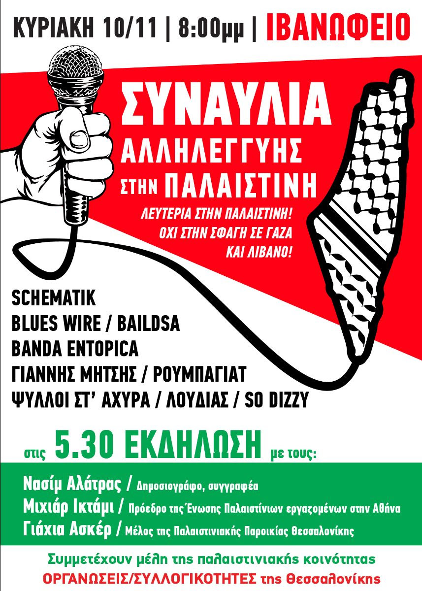 Στηρίζουμε την αυριανή εκδήλωση και συναυλία στο Ιβανώφειο που διοργανώνουν Οργανώσεις/Συλλογικότητες της Θεσσαλονίκης και μέλη της Παλαιστινιακής Κοινότητας της Θεσσαλονίκης.