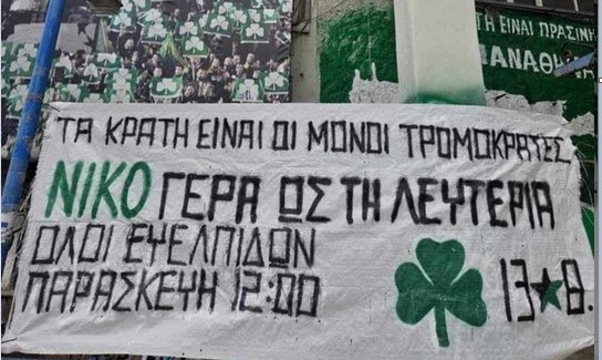 Οι Αντιφασίστες Οπαδοί του Παναθηναϊκού, στάθηκαν στο πλευρό του νέου θύματος της αστυνομικής σκευωρίας Νίκου Ρωμανού με αναλυτική τους ανακοίνωση. Τώρα μας στέλνουν την φωτογραφία ενός πανώ που ανάρτησαν στο γήπεδο του Παναθηναϊκού, στο οποίο υπάρχει κάλεσμα για μαζική παρουσία αύριο στο κτήριο της Ευελπίδων όπου αναμένεται να παρουσιαστεί σε ανακρίτρια ο νεαρός αναρχικός.
