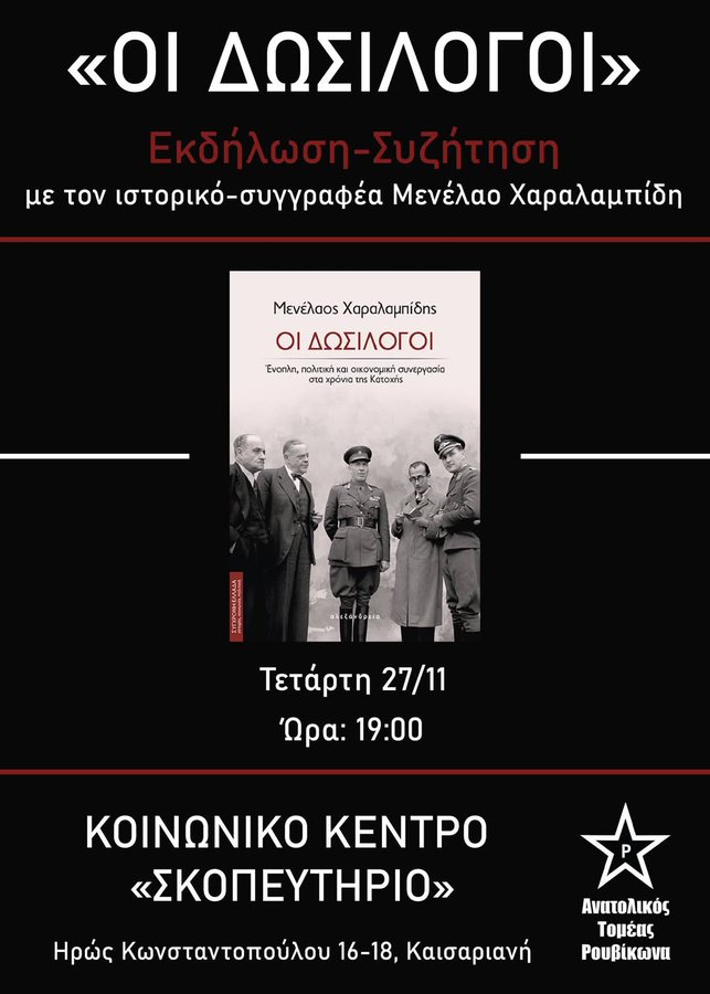 Αύριο Τετάρτη 27/11, ο Ανατολικός Τομέας του Ρουβίκωνα απευθυνθεί κάλεσμα για συμμετοχή σε μια συζήτηση με τον ιστορικό και συγγραφέα Μενέλαο Χαραλαμπίδη, με αφορμή την έκδοση του βιβλίου του “ΟΙ ΔΩΣΙΛΟΓΟΙ”, στις 7 το απόγευμα στο Κοινωνικό Κέντρο “Σκοπευτήριο” στη Καισαριανή (Ήρως Κωσταντοπούλου 16-18)