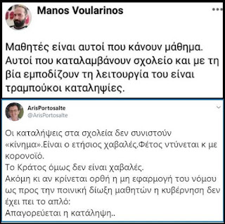 Επανερχόμαστε στο θέμα μας. Ο γνωστός απεργοσπάστης στο χώρο που δουλεύει, στο μαγαζί στο μαγαζί του Αλαφούζου και στον βόθρο της Athens Voice, Μάνος Βουλαρίνος, όταν δεν ζητάει δημόσια συγνώμη για τα εμέσματα που γράφει στο διαδίκτυο, όπως τότε με την περίπτωση του Αντώνη Τζανακόπουλου, και όταν δεν ξεπλύνει μπάτσους-βασανιστές, χύνει τα εμέσματά του σε κάθε αγωνιζόμενο κλάδο με ιδιαίτερη προτίμηση στην μαθητιώσα νεολαία.