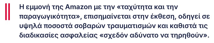 Αντίθετα, τονίζεται, αν και ο γίγαντας του ηλεκτρονικού εμπορίου γνώριζε ότι οι πολιτικές του βλάπτουν τους υπαλλήλους του, έχει επανειλημμένα επιλέξει να αγνοήσει όλες τις σχετικές εσωτερικές έρευνες, στο βωμό του εταιρικού κέρδους.