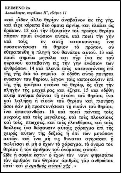 Και τους κάνει όλους μικρούς και μεγάλους, πλούσιους και φτωχούς, ελεύθερους και δούλους, να βάλουνε το χάραγμα πάνω στο δεξί χέρι ή πάνω στα μέτωπά τους και να μη μπορεί κανένας να αγοράσει ή να πουλήσει παρά μόνο όποιος έχει το χάραγμα, το όνομα του θηρίου ή τον αριθμό του ονόματος του. Εδώ είναι η σοφία. Όποιος έχει μυαλό ας αναλύσει τα ψηφία του αριθμού του θηρίου διότι είναι αριθμός ανθρώπου. Και ο αριθμός του είναι 666…
