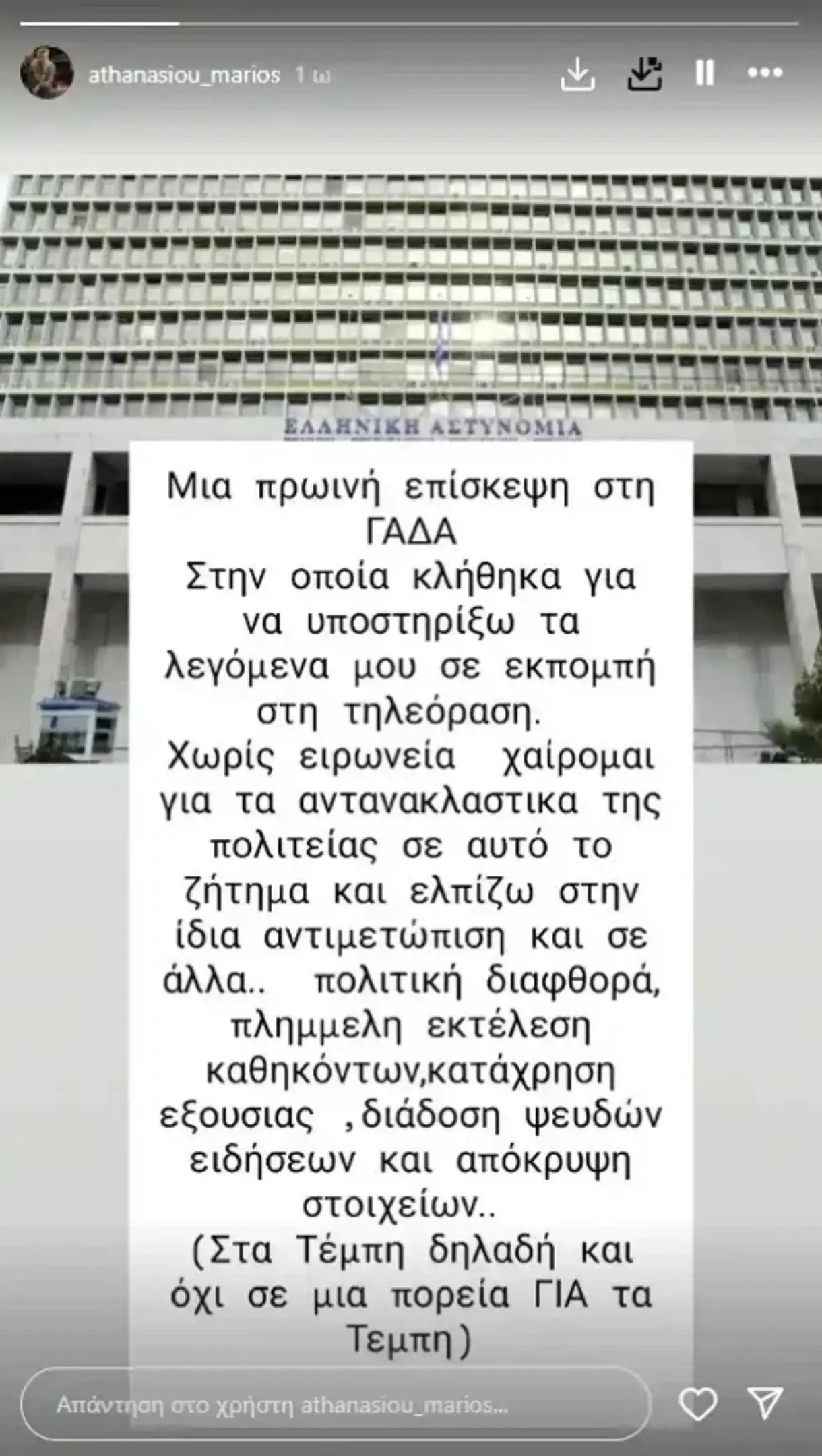 Σήμερα, λοιπόν, όπως μας πληροφορεί ο γνωστός ηθοποιός Μάριος Αθανασίου, τον κάλεσαν στην ΓΑΔΑ και του ζήτησαν εξηγήσεις γιατί σε τηλεοπτική εκπομπή του Attica Tv δήλωσε παραμονές των συλλαλητηρίων για τα Τέμπη: