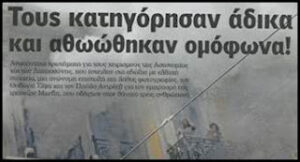 «Ομόφωνα αθώοι κρίθηκαν από το Πρωτοβάθμιο Κακουργιοδικείο ο Θοδωρής Σίψας και ο Παύλος Αντρέεβ, που ήταν κατηγορούμενοι για τον φονικό εμπρησμό της MARFIN ο πρώτος, ενώ ο δεύτερος για τη βομβιστική επίθεση στο βιβλιοπωλείο ΙΑΝΟΣ, στα επεισόδια κατά τη διάρκεια συλλαλητηρίου, τον Μάιο του 2010, για το πρώτο μνημόνιο».