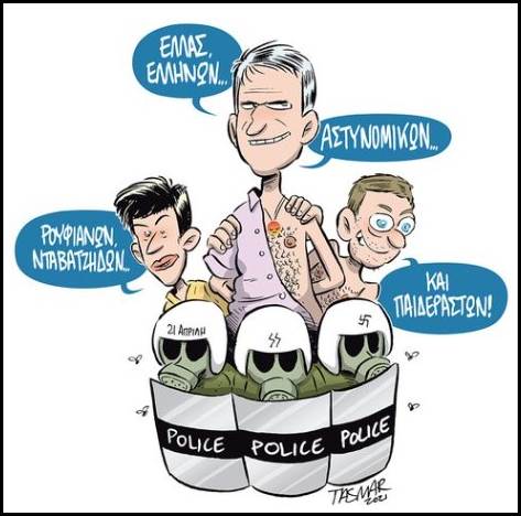Την ίδια στιγμή ο υπουργός Λιβάνιος διαβεβαίωνε ότι όλοι οι δημόσιοι υπάλληλοι θα αξιολογηθούν. Όλοι; Όχι. Πλην των ένστολων και των δικαστικών λειτουργών. Οι συγκεκριμένοι έχουν αξιολογηθεί ήδη από τους κυβερνητικούς. Όχι μόνο επειδή οι αστυνομικοί ανοίγουν κεφάλια όσων τολμούν να εκφράζουν δημόσια τη διαφωνία τους. Δεν ορρωδούν προ ουδενός, πόσο μάλλον όταν έχουν απέναντί τους νέους ή συνταξιούχους, μια χούφτα ή εκατοντάδες χιλιάδες όπως στις 28 Φλεβάρη στο Σύνταγμα. Τότε που διέλυσαν το μέγα πλήθος με δακρυγόνα και αύρες. Πάντως και ο καταδικασμένος για trafficking στην Ηλιούπολη επανήλθε και ανέλαβε πάλι υπηρεσία στην αστυνομία.