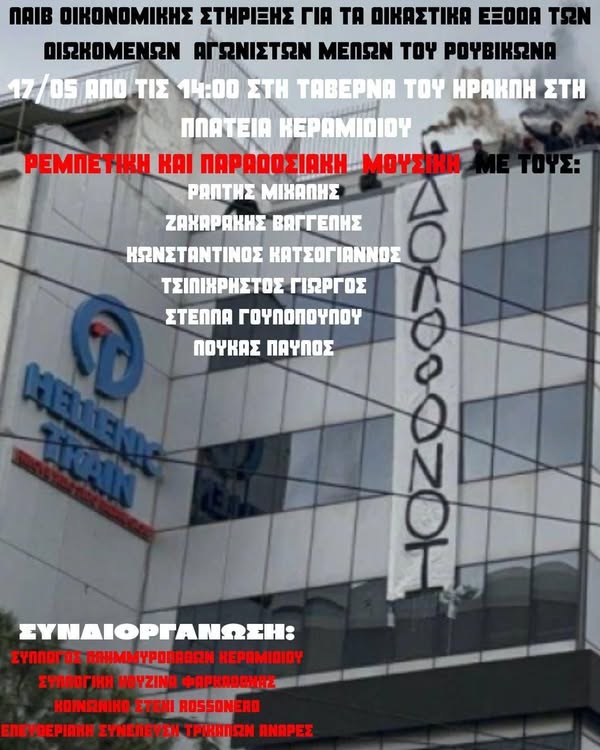 Καπάκι σ’ αυτό έρχεται τώρα άλλη μια εκδήλωση με ιδιαίτερο πολιτικό συμβολισμό. Ο σύλλογος πλημμυροπαθών Κεραμιδίου, η Συλλογική Κουζίνα Φαρκαδόνα, το κοινωνικό στέκι Rossonero και η ελευθεριακή συνέλευση Τρικάλων Ανάρες διοργανώνουν live το Σάββατο στην πλατεία του χωριού Κεραμίδι, με σκοπό να συγκεντρωθεί ένα χρηματικό ποσό που θα συμβάλει στο να ανταποκριθεί στα δικαστικά έξοδα που αντιμετωπίζουν τα μέλη του Ρουβίκωνα, μετά την ποινική δίωξη που έχει ασκηθεί σε βάρος τους έπειτα από την παρέμβαση στην ταράτσα της Hellenic Train στις 28 Φλεβάρη, ημέρα γενικής απεργίας δύο χρόνια μετά το έγκλημα των Τεμπών.