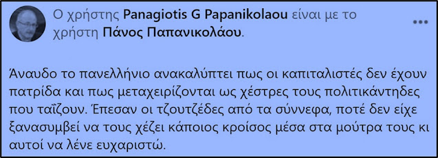 Όταν νυχθημερόν το αστικό πολιτικό σύστημα διαφημίζει, προβάλει, αναδεικνύει και ενίοτε αγιοποιεί την επιχειρηματική τους δραστηριότητα, όταν η βούλησή τους και οι εκάστοτε αξιώσεις τους γίνονται σεβαστές και νομοθετούνται στο όνομα της ανταγωνιστικότητας και της κερδοφορίας τους, όταν οι ίδιοι έχουν λόγο στην επιλογή του εκάστοτε Υπουργού Ε.Ν, όταν αποτελούν βασικοί χρηματοδότες των αστικών κομμάτων … αντιλαμβάνεσθε….