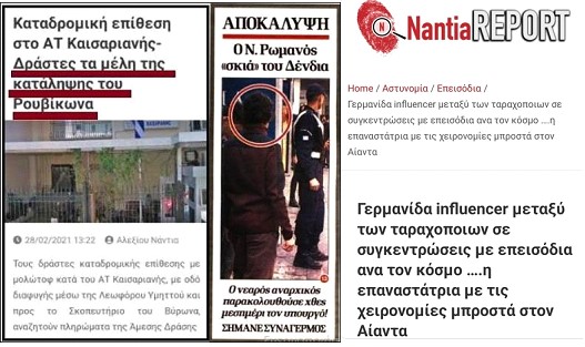 Τώρα μας “αποκαλύπτει” ότι “η επαναστάτρια με τις χειρονομίες μπροστά στον Αίαντα στα επεισόδια της Αθήνας, ταυτοποιήθηκε … Πρόκειται για τη σεσημασμένη 55χρονη Γερμανίδα influencer η οποία κινείται μεταξύ των ταραχοποιων, η ίδια επιλέγει να ταξιδεύει ανά τον κόσμο και συμμετέχει σε μεγάλες συγκεντρώσεις“. Γι’ αυτό το υποτιθέμενο γεγονός δεν έχουμε γνώση και δεν θα ήταν περίεργο μια προοδευτική Γερμανίδα να συμμετείχε στα συλλαλητήρια για τα Τέμπη.