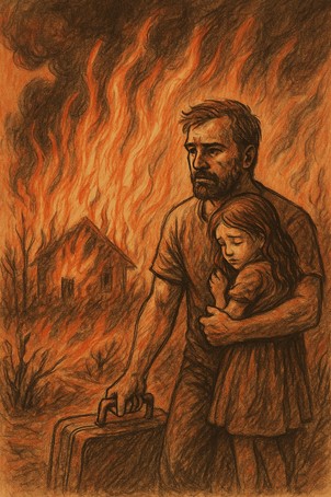 Τα σπίτια που φιλοξένησαν γενιές ολόκληρες, γέλια, τραπέζια Κυριακής, φωνές και τραγούδια, τώρα είναι σωροί από στάχτη και μαύρα καρβουνιασμένα δοκάρια. Το χώμα καίει ακόμα. Το βλέμμα των ανθρώπων είναι χαμένο, δεν ξέρουν αν αύριο θα έχουν τόπο να σταθούν.