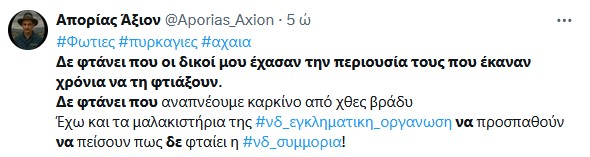 Δεν φταίει η κλιματική αλλαγή αλλά το ότι ψηφίσαμε το κόμμα του Νέρωνα. Υπάρχει κλιματική αλλαγή, αλλά αυτό θα έπρεπε να είναι η αφορμή να δοθούν όλα όσα χρειάζονται για την αντιμετώπιση των πυρκαγιών. Κοκορεύονται για τα όπλα που θα αγοράσουν. Για τα περιπολικά. Ε ας αγοράσουν λιγότερα, κι ας δώσουν όσα πρέπει για τις πλημμύρες και τις πυρκαγιές. Δεν το κάνουν, γιατί προφανώς υπάρχουν συμφέροντα.