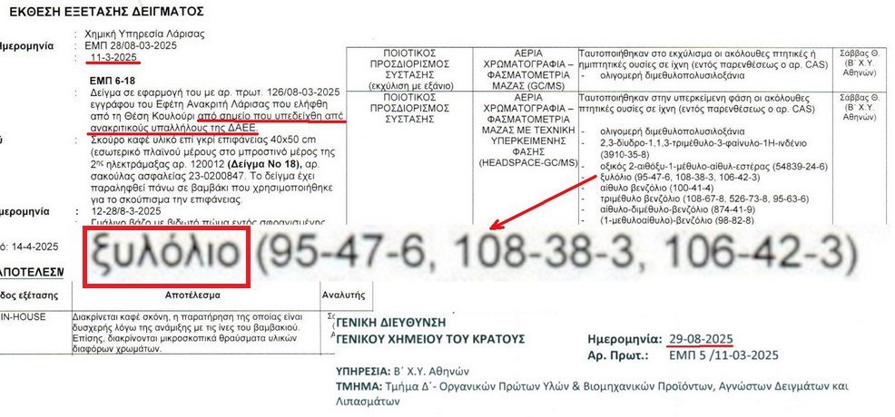 Το Γενικό Χημείο του Κράτους σε έγγραφο που απέστειλε στις 29 Αυγούστου 2025 -κι ενώ η ανακριτική διαδικασία έκλεινε- ανέφερε ότι σε 12 από τα 28 δείγματα που εξέτασε από τα κρίσιμα σημεία των συντριμμιών του τραίνου, εντόπισε ξυλόλιο, βενζόλιο κι άλλους κυκλικούς υδρογονάνθρακες. Μάλιστα, τα περισσότερα από αυτά τα δείγματα είχαν ληφθεί από τη δεύτερη ηλεκτράμαξα της εμπορικής αμαξοστοιχίας για την οποία είχαν διατυπωθεί ερωτήματα αν μετέφερε παράνομο φορτίο.