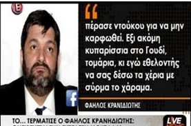 Πλάκα είχε ο Φαύλος Κρανιδιώτης, που λίγη ώρα πριν έλεγε πως τάχα οι Αριστεροί δε λέμε τίποτα για τους χριστιανούς που διώκονται κι άλλες τέτοιες κουταμάρες. Φυσικά μετά τη συνάντηση των καθαρμάτων οι φάπες έπεσαν βροχή σε τέτοιο σημείο που ζαλισμένος άλλαξε βιολί. Μίλησε για εθνικό συμφέρον!