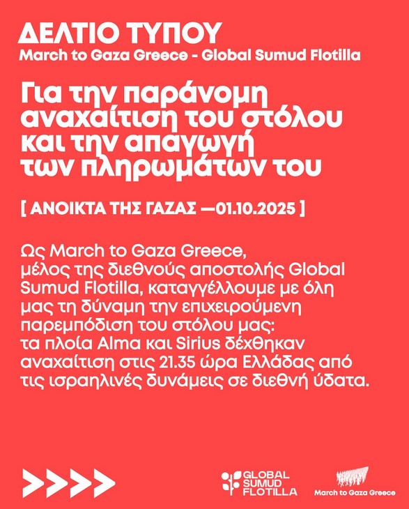 ‼️ Καταγγέλουμε την επίθεση του Ισραήλ στο Global Sumud Flotilla και την απαγωγή των πληρωμάτων τους. Επιτέθηκαν σε μια ειρηνική αποστολή που μετέφερε τρόφιμα και φάρμακα στον λαό της Γάζας που δύο χρόνια τώρα υποφέρει από τη γενοκτονική επίθεση του Ισραήλ.