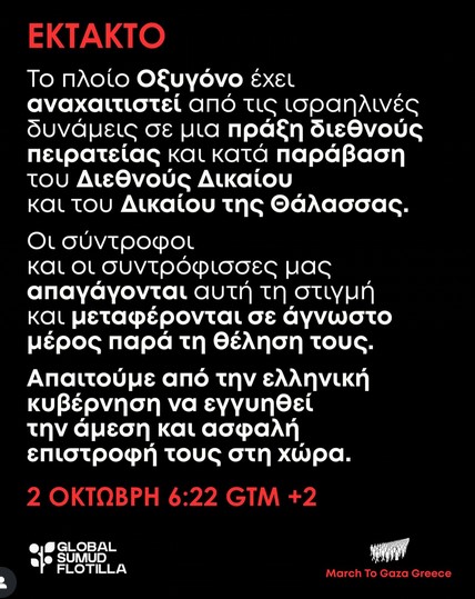 Στα ξημερώματα της 2ας Οκτωβρίου 2025, οι δολοφόνοι του Ισραηλινού Στρατού (IDF) έπληξαν ξανά την ανθρωπιστική αλληλεγγύη, καταλαμβάνοντας το ελληνικό πλοίο «Οξυγόνο», ένα από τα πλοία της ιστορικής Global Sumud Flotilla, που κατευθυνόταν προς τη Γάζα φορτωμένο με ιατρική βοήθεια, τρόφιμα και φάρμακα για τον βασανισμένο παλαιστινιακό λαό.