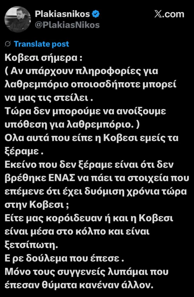Κάτι ανάλογο συνέβη και με το τελευταίο ποστ του στο οποίο σχολίαζε απόσπασμα από την συνέντευξη της Ευρωπαίας εισαγγελέας. Και φυσικά ούτε αυτή η παρέμβαση του Πλακιά πέρασε απαρατήρητη, με αποτέλεσμα ο δημοσιογράφος Ιορδάνης Χασαπόπουλος να κάνει σχετική ερώτηση στην Μαρία Καρυστιανού την οποία είχε φιλοξενούμενη στην εκπομπή του.