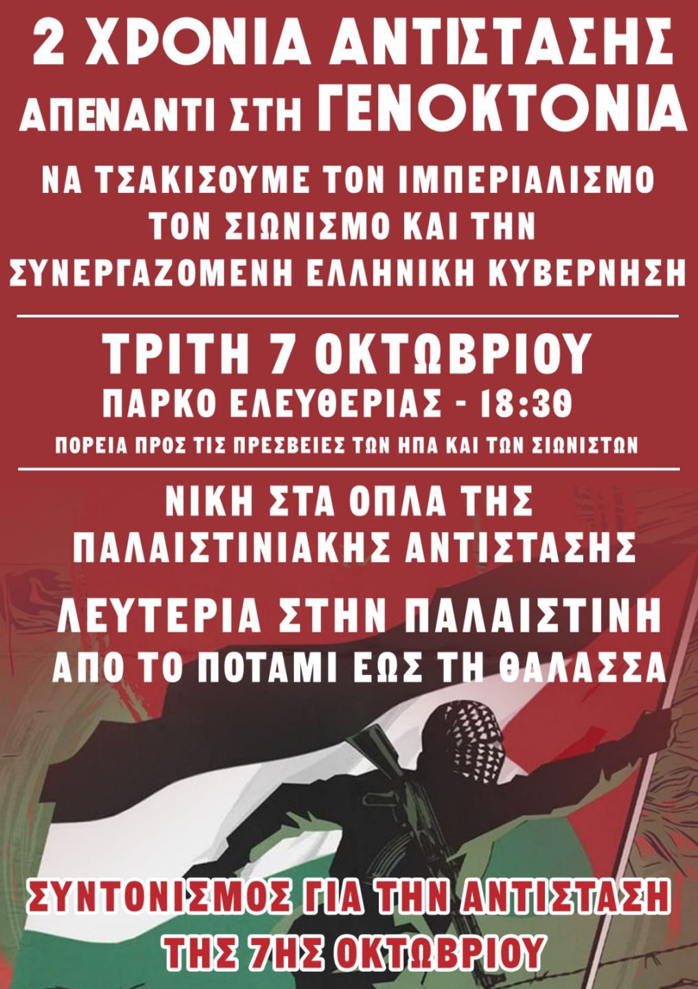 Πάνω σε αυτή τη συνθήκη, αναγνωρίζοντας πως η ελληνική αστική τάξη και η κυβέρνηση έχουν ταχθεί αναφανδόν με τον ιμπεριαλιστικό άξονα ΗΠΑ-ΝΑΤΟ-ΕΕ και στηρίζουν το σιωνιστικό κράτος – τρομοκράτη του Ισραήλ, την 7η του Οκτώβρη οφείλουμε να δώσουμε δυναμικά το παρόν και να απαιτήσουμε στην πράξη την παύση κάθε είδους συνεργασίας με την σιωνιστική κρατική οντότητα!