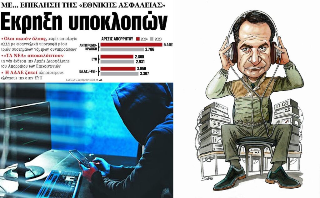 Σε μια χώρα όπου η δημοκρατία έχει μετατραπεί σε φάρσα, η ετήσια έκθεση της Αρχής Διασφάλισης του Απορρήτου των Επικοινωνιών (ΑΔΑΕ) για το 2023 έρχεται να ρίξει φως στο σκοτεινό υπόγειο ενός συστήματος που παρακολουθεί, κατασκοπεύει και πατάει στο λαιμό κάθε αντίθετη φωνή. Το σημερινό πρωτοσέλιδο δημοσίευμα των Νέων που υπογράφει ο Βασίλης Λαμπρόπουλος, και ανακυκλωνεται από όλα τα ενημερωτικά ΜΜΕ, δεν εντυπωσιάζει κανέναν δεδομένου ότι είχαμε το προηγούμενο με το ρεσιτάλ των υποκλοπών που οδήγησε στις παραιτήσεις Δημητριάδη – Κοντολέων.