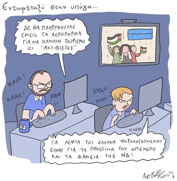 Την ώρα, που το κράτος – το ίδιο κράτος που πληρώνει τα δικά τους «παιδιά» – φέρνει πίσω Έλληνες πολίτες, που είχαν απαχθεί από το Ισραηλινό κράτος, ξαφνικά θυμούνται τη λογοδοσία. Γιατί; Γιατί θεωρούν ότι η αριστερά και οι ακτιβιστές είναι εύκολος στόχος. Γιατί η προπαγάνδα της ΝΔ χτίζεται πάνω στην απόσπαση προσοχής: από τα σκάνδαλα Tempi, τις offshore των Μητσοτάκη, τις χρυσές βίζες και τα ρουσφέτια του ΟΠΕΚΕΠΕ, περνάμε σε «ποιος πλήρωσε το αεροπλάνο για τη Γάζα».