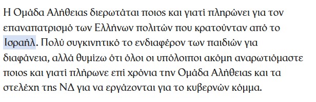 Η οικονομική εισαγγελία, άλλωστε, έχει βάλει στο στόχαστρο την υπόθεση από τον Ιούλιο, ερευνώντας πώς δημόσιο χρήμα καταλήγει σε μηχανισμούς παραπληροφόρησης. «Ο ελληνικός λαός έχει δικαίωμα να γνωρίζει πώς αξιοποιούνται τα χρήματά του», έλεγε το Inside Story, και είχε δίκιο. Αλλά η κυβέρνηση απαντά με σιωπή και ειρωνεία: «Δεν καταλαβαίνω το ερώτημα», είπε ο Παύλος Μαρινάκης σε δημοσιογράφους τον Απρίλη. Κλασική τακτική: όταν πιάνεσαι, κάνε τον ανήξερο.Και εδώ έρχεται το ζουμί της υποκρισίας. Ενώ οι ακτιβιστές της Γάζας – ανάμεσά τους και βουλευτής της «Νέας Αριστεράς» – αγωνίζονταν για ανθρωπιστική βοήθεια σε μια περιοχή βομβαρδισμένη από ισραηλινά τανκς, η «Ομάδα Αλήθειας» στήριζε ανοιχτά την πολιτική Νετανιάχου από τα πληκτρολόγιά της.