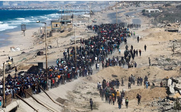 Σε ένα βίντεο από την Al Jazeera, χιλιάδες διασχίζουν τον παράκτιο δρόμο κοντά στο Wadi Gaza, με σημαίες να ανεμίζουν σαν φάροι ελπίδας.