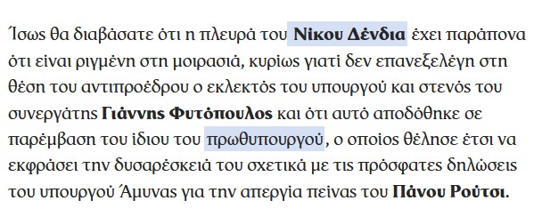 Κι έτσι σήμερα, στα ξεκάρφωτα, διαβάζουμε σε παραπολιτικό σχόλιο στην “Καθημερινή” -που όποιος γνωρίζει πώς παίζεται το επικοινωνιακό παιχνίδι με τους πολιτικάντηδες αντιλαμβάνεται με την πρώτη ματιά ότι είναι υποβολιμαίο, και μάλιστα ο συντάκτης του δεν το κρύβει γράφοντας: “Πηγές που πρόσκεινται στον υπουργό Αμυνας λένε πως ο κ. Δένδιας δεν έχει καμιά πρόθεση να χρεωθεί πως υπονομεύει την κυβέρνηση -αναφέρεται στην ηχηρή διαφοροποίηση του υπουργού Αμυνας στο θέμα του Πάνου Ρούτσι-. Από την άλλη, το Μαξίμου έδειξε εξαρχής πως δεν θέλει να ανοίξει μέτωπο με τον υπουργό”.