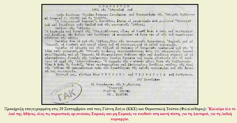 Προκήρυξη που υπογράφεται από τους Γιάννη Ζεύγο (ΚΚΕ) και Θεμιστοκλή Τσάτσο (Φιλελεύθερος) στις 29 Σεπτεμβρίου 1944 -σχεδόν έναν μήνα μετά την είσοδο του ΕΑΜ στην κυβέρνηση του Γ. Παπανδρέου και τρεις ημέρες μετά τη συμφωνία της Καζέρτας που υπήγαγε τις ελληνικές ένοπλες δυνάμεις, αντάρτικες και τακτικές, μέσω της ελληνικής κυβέρνησης στον Βρετανό υποστράτηγο Ρόναλντ Σκόμπι– καλεί τον ελληνικό λαό σε ενότητα και παραδειγματική τήρηση της τάξης.