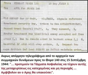 Στο άρθρο, λοιπόν αυτό συναντάμε ένα άκρως απόρρητο τηλεγράφημα από το αρχηγείο συμμαχικών δυνάμεων προς τη Φορς 140 στις 15 Σεπτέμβρη 1944.