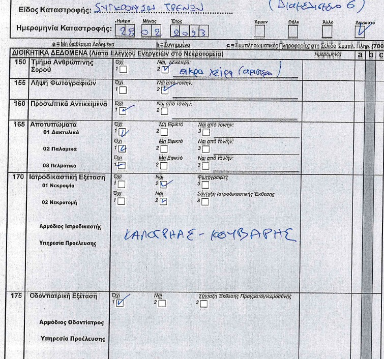 Στο δεύτερο έγγραφο που βλέπετε παρακάτω εμφανίζονται ξανά σε άλλη ιατροδικαστική έκθεση τα ονόματα των ιατροδικαστών από την Αθήνα (Καλογρηας – Κουβαρης) που σε κάθε περίπτωση ενεργούν πάντα κάτω από τις εντολές του προϊσταμένου τους Ν. Καρακούκη μιας και ανήκουν στο δυναμικό της ΙΔΥ Αθηνών.