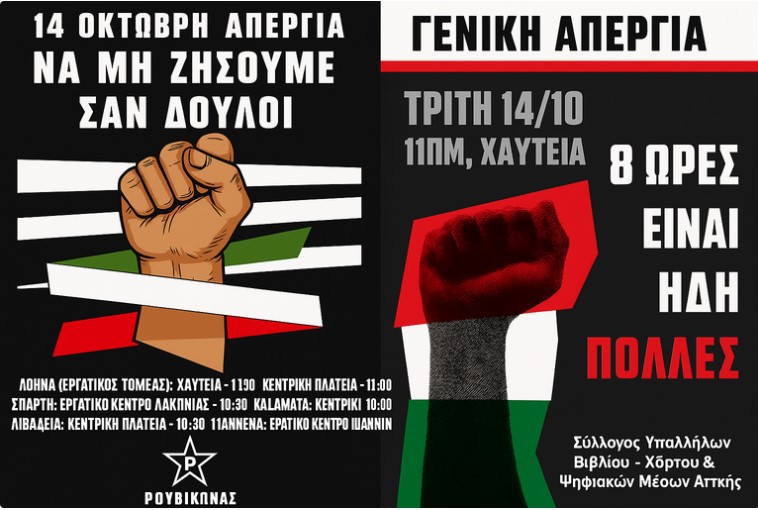 Η ΓΣΕΕ υπονομεύει τους αγώνες μας, στέκεται εμπόδιο στην πάλη των εργαζομένων, προκαλεί την οργή μας, αφού και αυτή την πολύ κρίσιμη στιγμή αρνείται να προκηρύξει απεργία για να συνεχιστεί και να κλιμακωθεί ο αγώνας μας μέσα και έξω από τους χώρους δουλειάς μας. Τι ειρωνεία, τι εμπαιγμός να καλεί στη συγκέντρωση και τη διαδήλωση! Ξέρουμε καλά ότι την αντιπαράθεση με όλους τους αντεργατικούς νόμους δεν θέλει και δεν μπορεί να τη «σηκώσει» η υποταγμένη γραφειοκρατία της ΓΣΕΕ και των Ομοσπονδιών, που αποτελούν φιλο-εργοδοτικά και φιλο-κυβερνητικά θεσμικά όργανα. Μόνο ένας δρόμος υπάρχει για μας τους εργαζομένους, συλλογική και από τη βάση αντίσταση και πάλη ενάντια στα αντεργατικά τερατουργήματα που απαξιώνουν κατάφωρα τις συνθήκες εργασίας, την υγεία, τη ζωή μας. Η επίθεση των κυβερνήσεων και των εργοδοτών δεν πρόκειται να σταματήσει, αν δεν τους σταματήσουμε εμείς. Η αδηφαγία τους για κέρδος (άρα και για εκμετάλλευση της εργασίας μας και της ζωής μας) δεν έχει ταβάνι. Θέλουν όλο και περισσότερα. Ταυτόχρονα το κράτος επιτίθεται και σε αγωνιζόμενες/ους εργαζόμενες/ους που υπερασπίζονται το δικαίωμα του Λαού της Παλαιστίνης για την Λευτεριά. Με πρόσφατο παράδειγμα τη σύλληψη του συναδέλφου Ι.Α. που συμμετείχε στην πορεία αλληλεγγύης στην Παλαιστίνη μετά από απρόκλητη τρομοκρατική επίθεση των δυνάμεων καταστολής.
