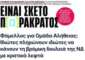 Θυμίζω ότι αποδείχθηκε πως και οι τιμηθέντες και όλος ο μηχανισμός τρολ γύρω από την ομάδα αυτή, αμειβόταν (και αμείβεται;) από μια ιδιωτική εταιρεία με ελάχιστη άλλη δραστηριότητα, την Blue Skies, η οποία με την σειρά της ανήκε στην γνωστή και μη εξαιρετέα V&O των Βαρβιτσιώτη και Ολύμπιου, η οποία είναι η βασική εταιρεία επικοινωνίας και lobbying που χρησιμοποιεί η ΝΔ.