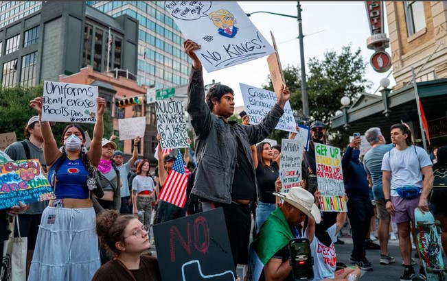 Το κίνημα “No Kings” (Κανένας Βασιλιάς), ένας συνασπισμός προοδευτικών οργανώσεων όπως το Indivisible, το ACLU, το MoveOn και συνδικάτα όπως η American Federation of Teachers, καλεί σε αντίσταση ενάντια στην “αυταρχική” πολιτική του προέδρου Ντόναλντ Τραμπ. Εκατομμύρια πολίτες – εκτιμήσεις μιλούν για 5 εκατομμύρια ή και περισσότερους – έχουν βγει στους δρόμους, φορώντας κίτρινα ρούχα ως σύμβολο ενότητας, εμπνευσμένοι από αγώνες σε Ουκρανία, Χονγκ Κονγκ και Νότια Κορέα.