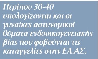 Αυτό που επίσης είναι εντυπωσιακό σ’ αυτό, σχετικά με τα κρούσματα ενδοοικογενειακής βίας στη χώρα μας, είναι ότι με τα δεδομένα της ΕΛ.ΑΣ, τουλάχιστον 30-40 γυναίκες αστυνομικοί δέχονται τέτοιου είδους κακοποιητικές συμπεριφορές από τους συζύγους τους. (Δεν διευκρινίζει πόσοι απ’ αυτούς είναι αστυνομικοί). Κι όμως ούτε αυτές, στην συντριπτική τους πλειοψηφία τολμούν “να απευθυνθούν στα 18 γραφεία ενδοοικογενειακής βίας της ΕΛ ΑΣ. γιατί θεωρούν ότι αν το πράξουν θα γνωστοποιηθεί μεταξύ των συναδέλφων τους το πρόβλημά τους στο εσωτερικό των αστυνομικών υπηρεσιών και θα διασυρθούν ή θα αντιμετωπίσουν κι άλλα προβλήματα”.