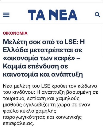 Η εικόνα της Ελλάδας που παρουσιάζει η νέα μελέτη του Ελληνικού Παρατηρητηρίου της London School of Economics (LSE) είναι αποκαρδιωτική: η χώρα μετατρέπεται με ταχύτητα σε μια «οικονομία των καφέ», εγκλωβισμένη σε ένα μοντέλο ανάπτυξης χαμηλής παραγωγικότητας, χαμηλών μισθών και κοινωνικής ανασφάλειας.